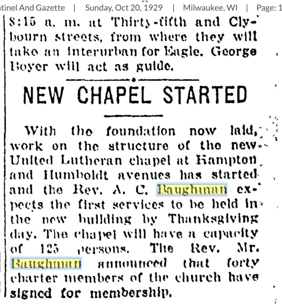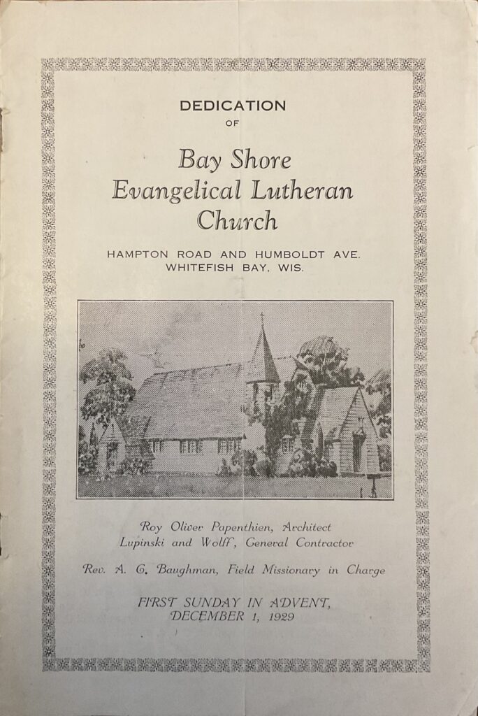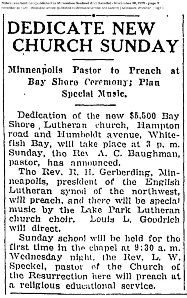 On October 20, 1929, the Milwaukee Sentinel reported that the foundation for Bay Shore Lutheran Church was laid and construction on the structure had begun.