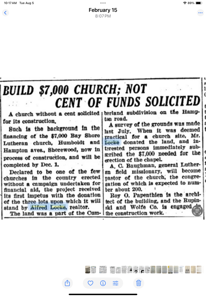 Alfred Locke died in1942 and was still listed as a member of Bay Shore Lutheran Church.