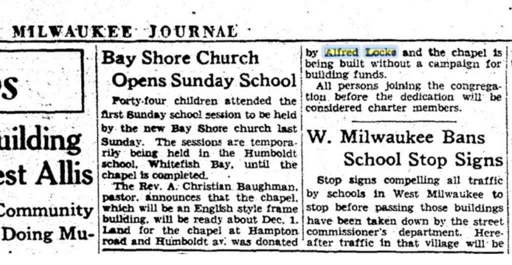 Alfred and Norma Locke were very active members of Epiphany (All People’s) Lutheran Church when they helped establish Bay Shore. Alfred was a real estate developer in Whitefish Bay. In 1929 he was developing the Cumberland Lawns subdivision. His gift to the new church was three undeveloped lots with an option to buy a fourth lot at present day Wildwood & Marlborough avenues. The church council was able to mortgage the lots to build the first church. Because the lots were undeveloped Alfred lease a developed lot at Hampton & Marlborough for the temporary location of the church until the lots were developed.