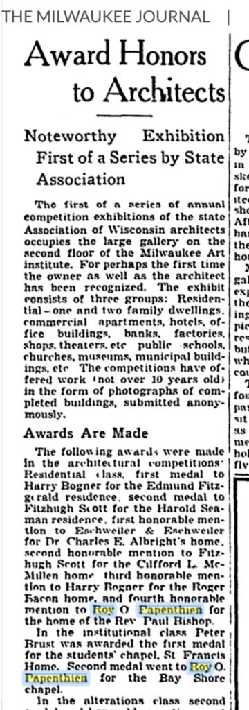In 1933 Roy Papenthein entered the Bay Shore Lutheran Chapel in the first architect design competition at the Layton school of Art and Design. Out of sixty entries the church came in third place capturing a bronze medal. A bronze plaque was hung in the church commemorating the accomplishment.